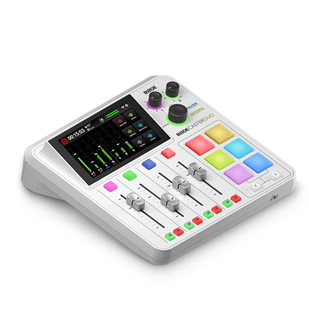 The Rode RODECaster Duo Integrated Podcast Production Studio is a powerful all-in-one solution designed for podcasters who demand professional-quality sound and streamlined production. Featuring two high-quality microphone inputs, the RODECaster Duo allows for seamless collaboration between hosts and guests. With advanced features like one-touch sound effects, customizable audio processing, and Bluetooth connectivity, this studio makes it easy to enhance your podcast with music, sound effects, and remote interviews. The intuitive touchscreen interface provides effortless control over your audio, ensuring a smooth recording experience. Whether you're just starting or looking to elevate your podcasting setup, the RODECaster Duo is the perfect companion for creating engaging content.