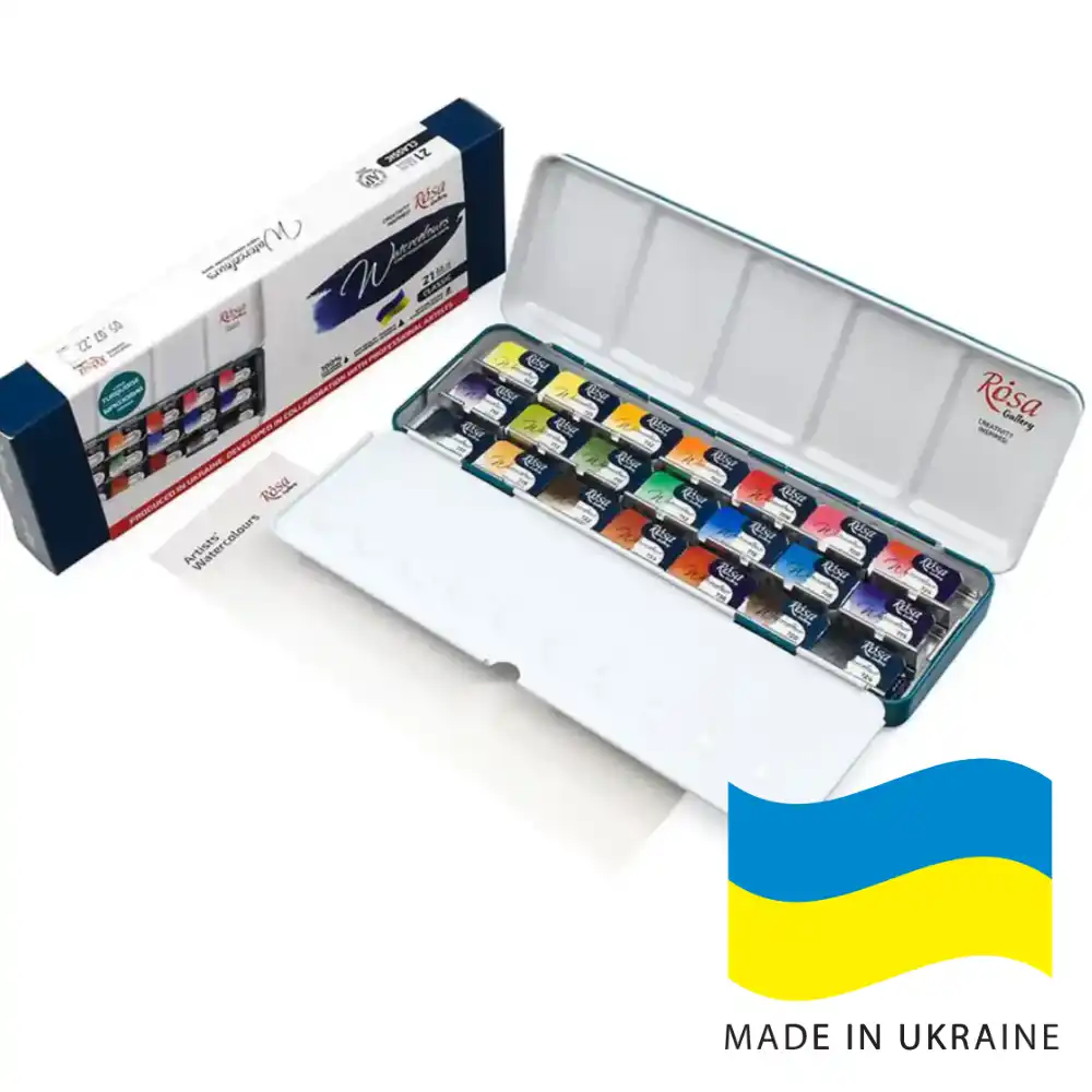 The Rosa Gallery Watercolour Classic 21 Whole Pan Metal Tin Set contains fourteen high quaity watercolour paints paints made in Ukraine. The set has a broad palette of colours perfect for mixing.