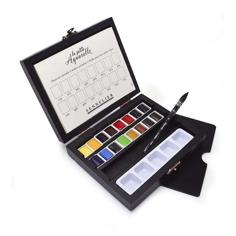 This set includes 16 fine watercolour half pans, a DIY colour chart, 1 Raphael 8056 'Softaqua' mini brush in size #4, a colour mixing palette and a paper pad. These are all contained in a compact, sturdy black traditional 'pochade' style wooden box, which is small and lightweight enough to carry around.