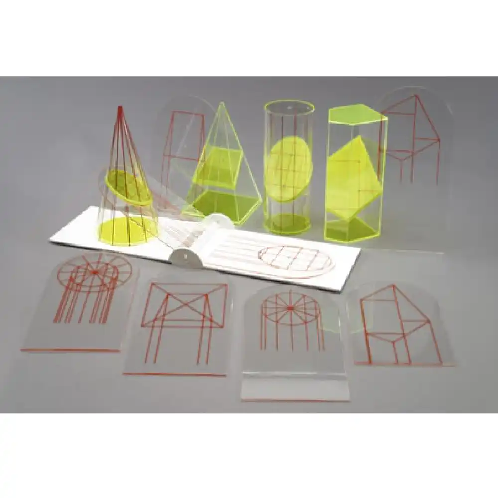 Code: 240/Sb 9 piece set of geometrical bodies, colored transparent. All geometrical bodies as shown in set 240/Sa: Prisms red, pyramids green, cylinder, cone and sphere blue.