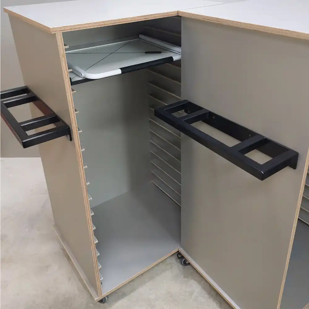 Flexible storage work station for STEM, STEAM and more. Makerspaces are increasingly popular in schools worldwide. A makerspace provides creative, hands-on ways to encourage students to collaborate, invent, design, and build their STEM or STEAM activities. These new storage trolleys have been designed specifically for makerspace in schools or anywhere else a flexible portable storage work station is needed. These holds standard trays on StopSafe runners, allowing easy and safe access to components. The tool hangers can be moved and changed to suit many objects.