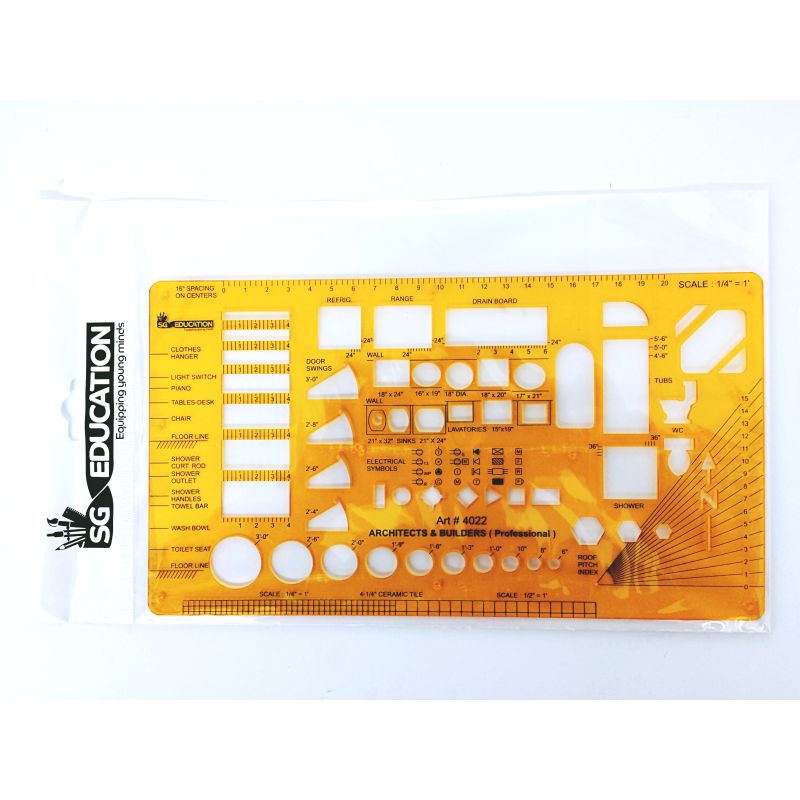Code SG 4022- Architect ; Builder Template SG Drafting/Designing Template is made from orange transparent plastic, (1.5mm). It may be used in many art and craft applications: Design, illustration and card making, to draw shapes on various surfaces.