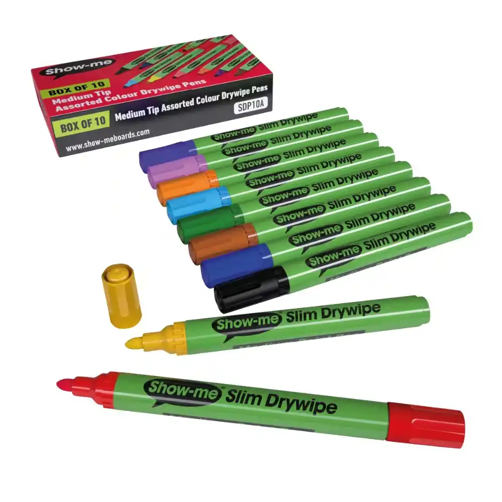 Show-me drywipe markers have been designed specifically for education, and they’re trusted by thousands of schools around the globe. Each pen benefits from: a slim barrel with easy fit lid, an extra-hard nib that will not easily splay out, and nib-stop that prevents the tip from being pushed into the barrel.