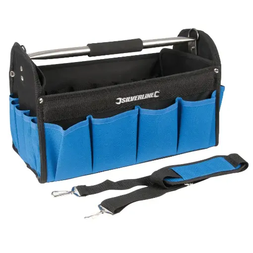 • Open tote design with aluminium carry bar and foam grip for easy access to tools.