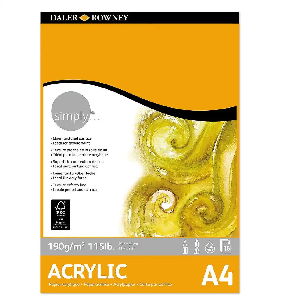 Simply A4 Acrylic Pad 190g by Daler Rowney is a reliable choice for acrylic artists, offering 16 sheets of high-quality, heavyweight paper that's perfect for various painting techniques. Its smooth texture and excellent paper weight make it an ideal surface for creating vibrant and expressive artworks.