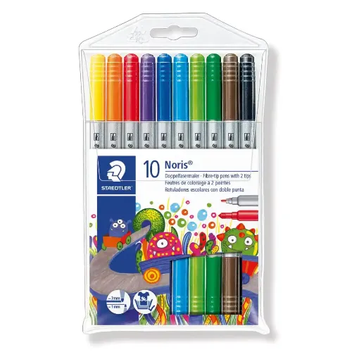 Staedtler Noris fibre tip pens are ideal for adding a splash of colour to artistic work. The tip writes a 1.0mm line for a precise and controlled stroke. Incorporating a ventilated cap with a breathing channel for extra safety, the ink is water-based and can be easily washed out from most textiles.