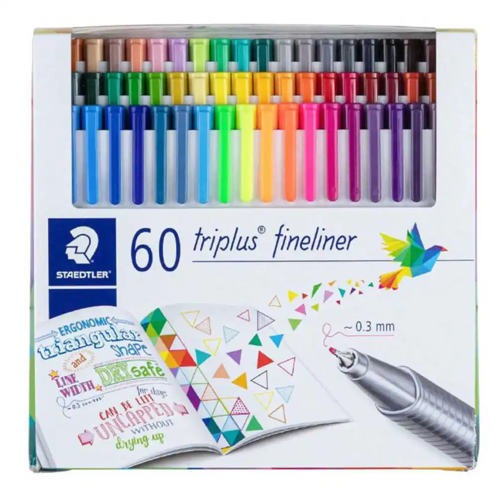 Staedtler Triplus Fineliner pack of 60 fineliners in assorted colours, ideal for sketching and drawing.