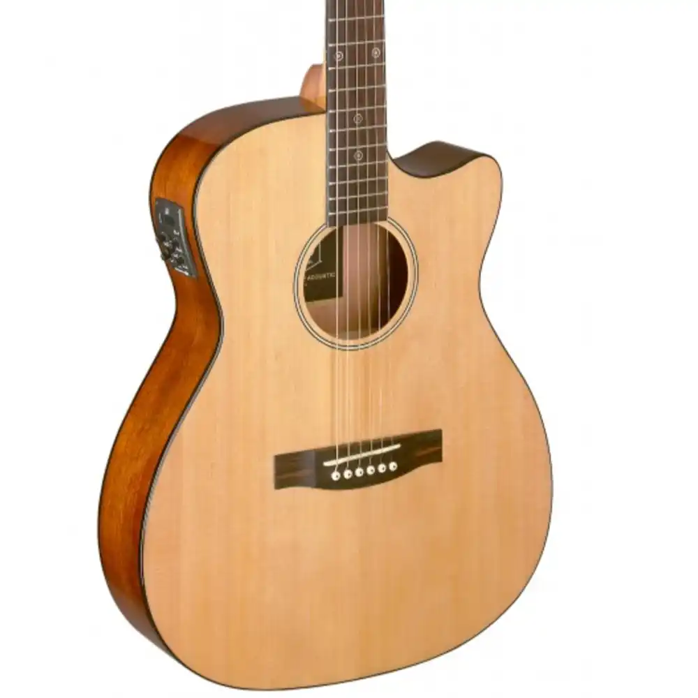 Electro-Acoustic Guitar. Smaller in size than it’s dreadnought cousin, auditorium style acoustic guitars offer equal measures of comfort and functionality, without losing projection. Popular among folk players, these models are perfect for finger-picking and can find their way around every register to achieve great presence.