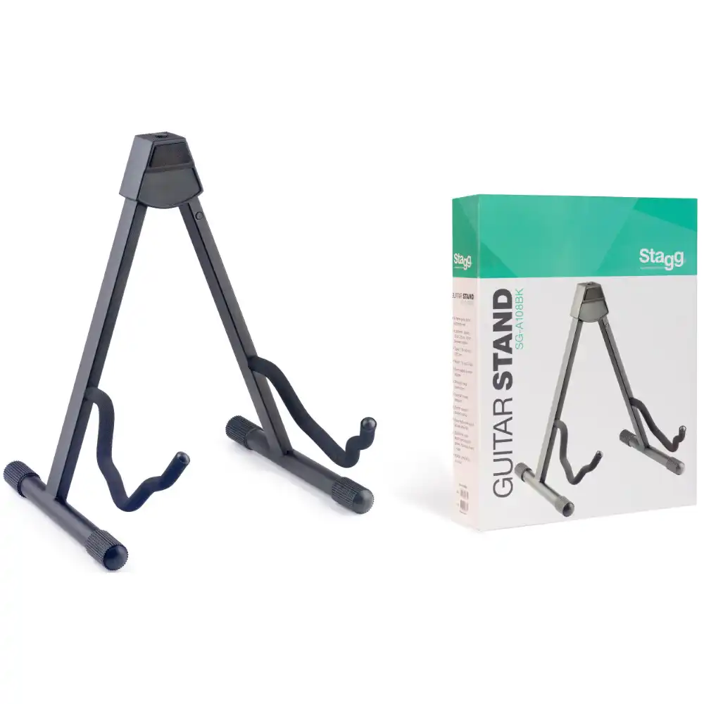 Stagg Acoustic / Electric Guitar Stand. The Stagg SG-A108BK features steel construction,2 cradling hooks and back rest with soft rubber covering to hold instrument securely and prevent it from scratching.There is a spring-loaded lock-pin mechanism to keep stand safely open. Folds flat for convenient storage and portability.