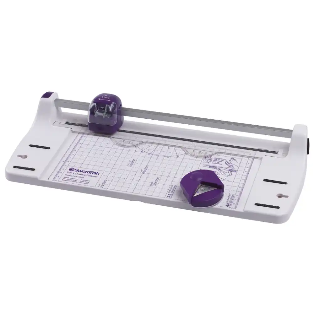 This space-saving rotary 5-in-1 Creative Trimmer will enable you to make straight cuts, wave cuts, perforations and score-lines with ease. The cutting head holds four different rotary blades – changing from one to another is quick and easy. The removable corner-trimmer produces neat round corners on your work. And – when you have finished, the Creative Trimmer folds away for easy storage!