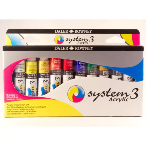 Daler Rowney System 3 Introduction to Acrylic 22ml. Perfect for art students and experienced acrylic painting pros alike, this set of acrylic paint gives you 22ml of rich colour within each tube. All colours can be thinned with water to pale washes or used directly from the pot or tube; each form dries quickly to create an insoluble film.