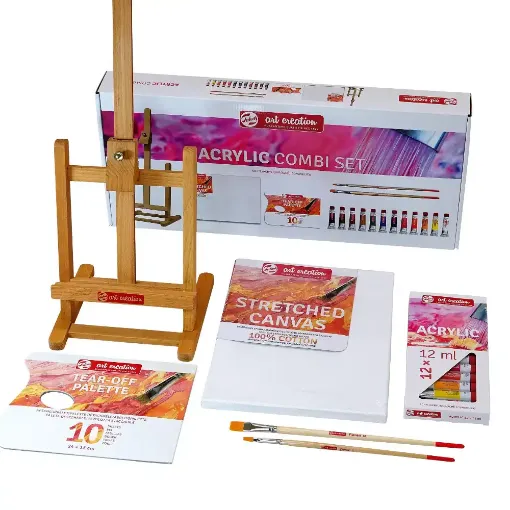 This combination set is the ultimate starter set for those looking to begin their acrylic painting journey! The set contains everything you need to get started: an acrylic colour set of 12 x 12 ml tubes in basic colours to build your palette with, a handy table easel, a stretched canvas of 24 x 30 cm, 2 acrylic painting brushes and a mess-free tear-off palette. It also includes a detailed step-by-step plan so you can easily create your own masterpiece. Taking up painting as a hobby has never been this easy!