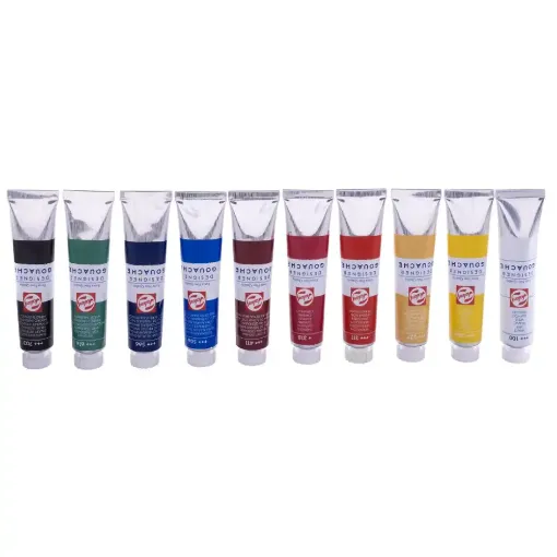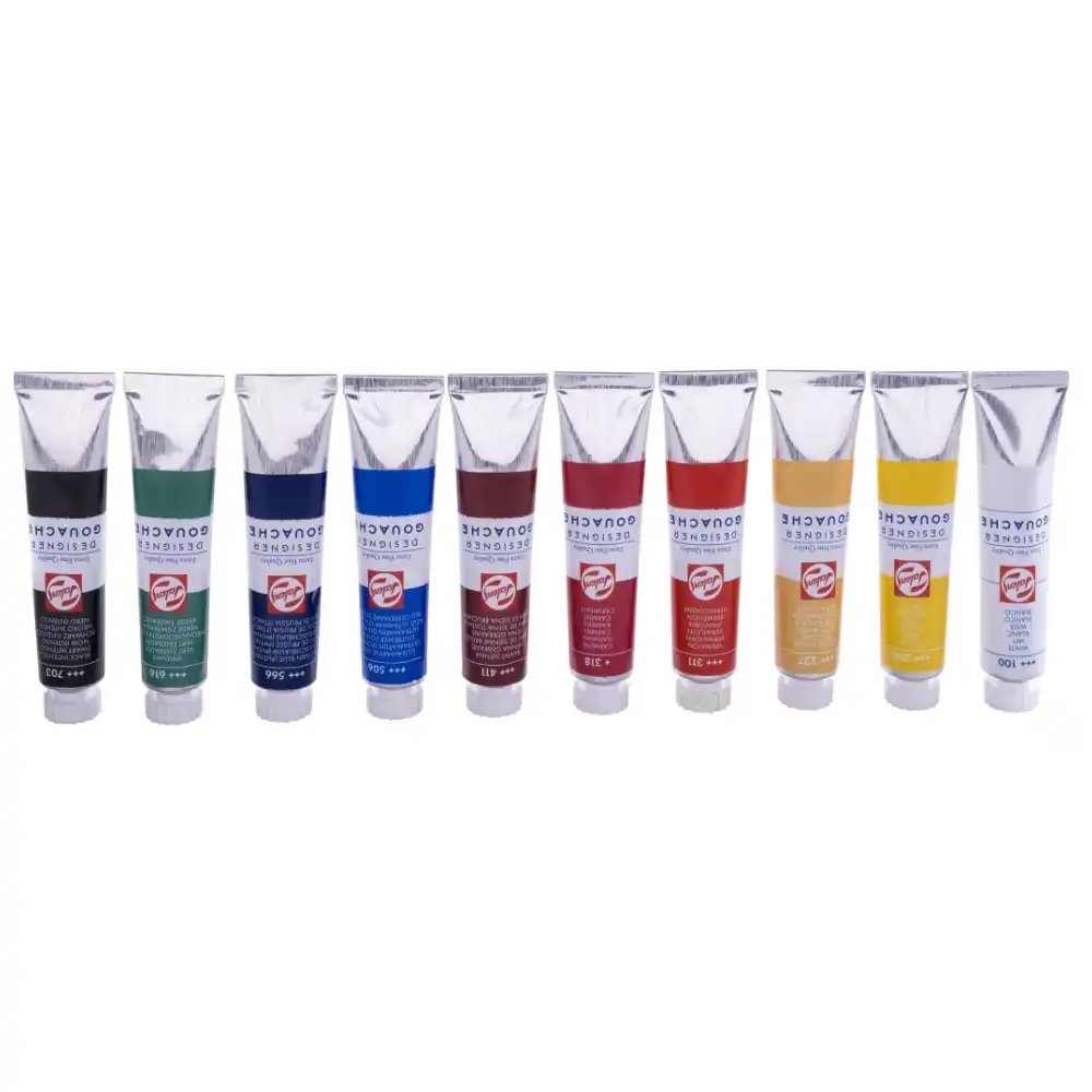 This gouache paint set includes 12 vibrant colours: White, Lemon Yellow, Medium Yellow, Brilliant Red, Crimson, Blue Lake, Ultramarine, Leaf Green, Emerald, Yellow Ochre, Burnt Sienna, and Black