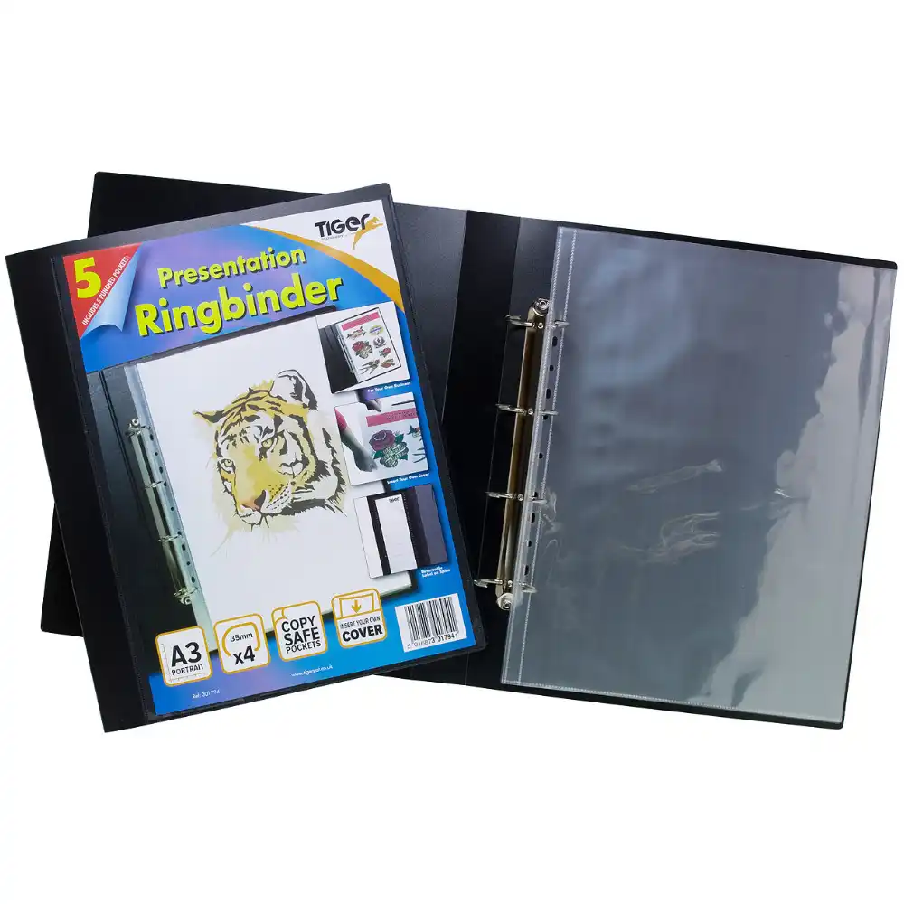 A3 Sized Portrait (440 x 335 x 50mm) presentation style ring binder. Black presentation ring binder with clear pocket on front to personalize to yourself, 5 clear pockets included which are copy safe and acid free.