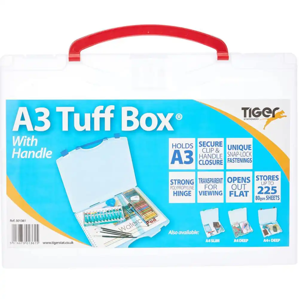The Tiger A3 Tuff Box with Handle is a reliable and rugged storage solution for your documents and supplies. Its sturdy construction and secure latch closure ensure that your items are protected from damage and loss. With its convenient handle, it offers easy portability, making it a practical choice for artists, students, and professionals on the move.