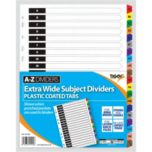 Whether you're a student, professional, or organizing important paperwork at home, the Tiger A4 Extra Wide A - Z Subject Dividers are a practical solution for keeping your documents neatly organized and easily accessible.