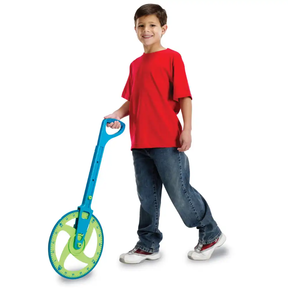 Students will find it easier to measure long distances with this sturdy plastic trundle wheel. Counting "clicker" clicks with each metre, so children see and hear the measurement. Non-slip rubber tyres provide an accurate reading.