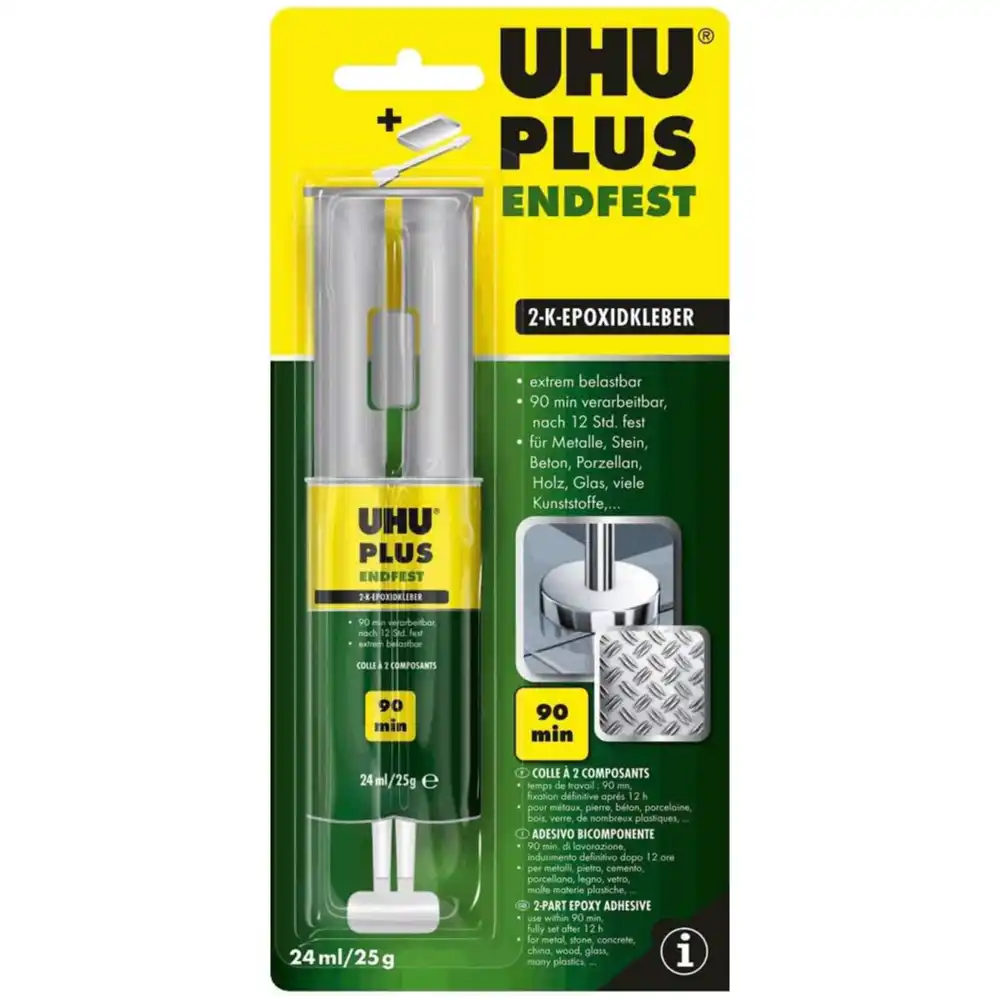 The UHU plus endfest in the practical double chamber syringe is a powerful 2-component epoxy resin adhesive designed for highest loads up to 3000N/cm².The processing time is up to 90 minutes, the curing time and final strength (up to 3000N/cm²) are temperature dependent. The adhesive is solid at room temperature after 12 hours. The user-friendly double-chamber syringe allows automatic dispensing of the 2 components in the correct mixing ratio.