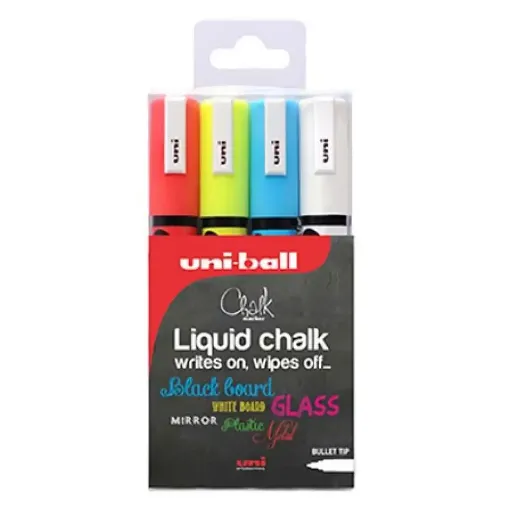 The uni-ball Chalk Marker range is water-based and gives vibrant colours that are perfect for striking-catching designs. Ideal for non-porous chalk boards or glass in pubs, cafés and restaurants. They are also rain resistant, making them great for use outdoors. The ink can be easily removed from non-porous surfaces using a damp cloth or mild detergent.