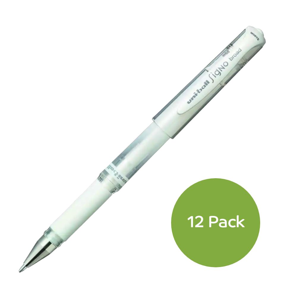 The Uni-ball Signo Broad Gel White Pens, in a pack of 12, offer smooth and opaque white ink for striking and bold designs. With their broad tip, these gel pens are perfect for adding highlights, lettering, and creating eye-catching artwork on various surfaces.