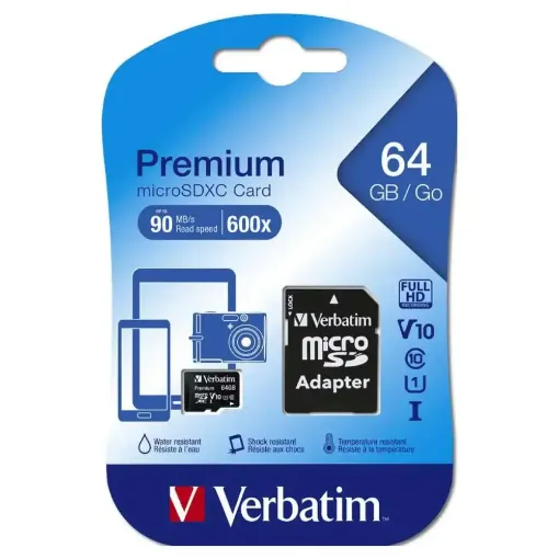The Verbatim microSDXC card with adapter range has two options 16GB or 64GB. The microSDXC memory card is designed especially for mobile phones. This tiny memory card consumes too little power therefore it preserves the battery life of your mobile phone. It can also be used in GPS devices, MP3 players, digital cameras and PDAs.