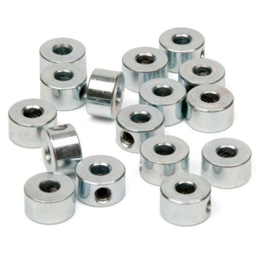 Use these collars to lock drive shafts and keep wheels and gears from sliding along the shaft. The collars fit around the drive shafts and are fastened in place using the grubscrews supplied. Designed specifically for the VEX Drive Shaft Inside diameter approx. 4mm Outside diameter approx. 11mm Grub screws use the same Allen key as the 6-32 Motor Screws