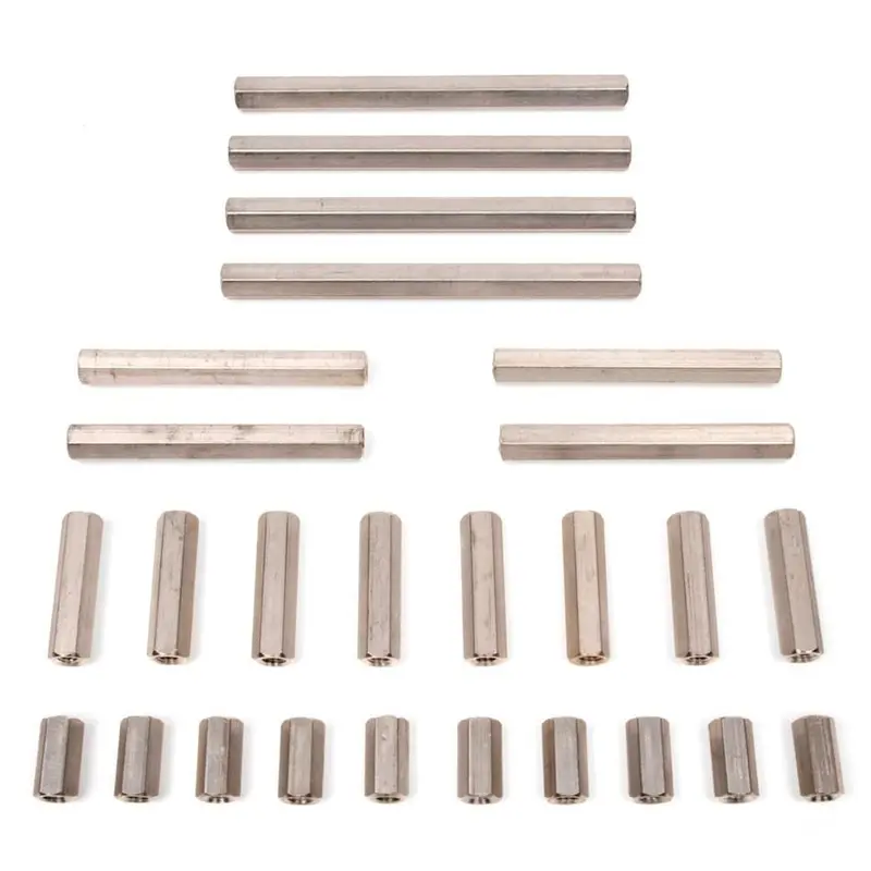 A pack of 26 assorted aluminium standoffs from VEX. The standoffs can be used in mechanics and electronics to separate two parts from one another. All VEX standoffs have 8-32 threads.