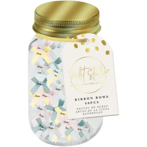 Violet Studio Ribbon Bow Jar - Brights, featuring 60 pieces, is a delightful addition to any crafting project! This jar contains an assortment of bold and vivid ribbon bows, offering numerous possibilities for adding a refined and cheerful accent to your creations.