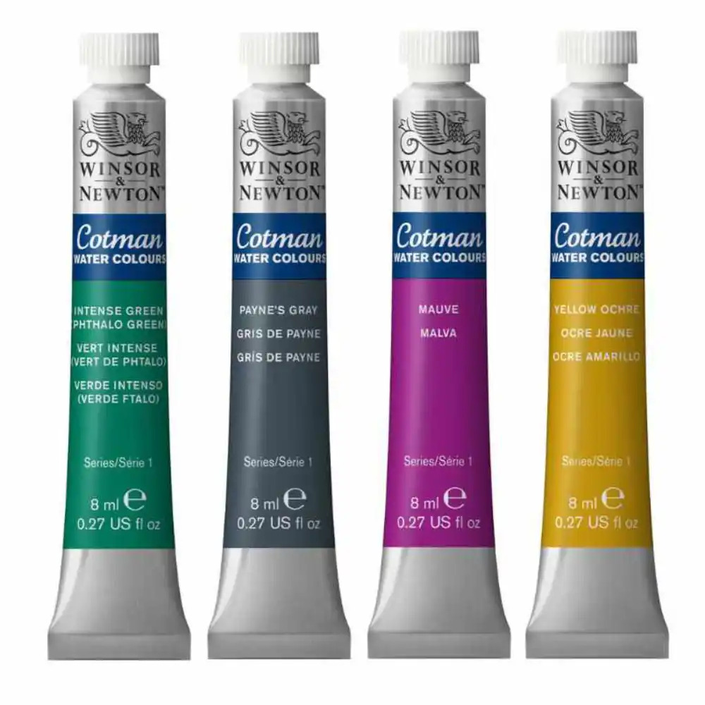 Chinese White, Lemon Yellow, , Gamboge (Hue), Cadmium Yellow (Hue), Cadmium Orange (Hue), Vermilion (Hue), Scarlet Lake, Rose Madder (Hue), Alizarin Crimson, Purple, Prussian Blue, Ultramarine, Cobalt Blue (Hue), Coeruleum (Hue), Leaf Green, Sap Green, Hookers Green, Viridian (Hue), Yellow Ochre, Light Red, Burnt Sienna, Burnt Umber, Paynes Grey, Ivory Black. Miniature Brush plus a compact metal case with a detachable palette
