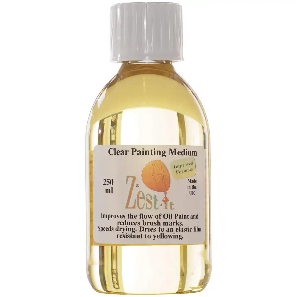 The Zest-it Clear Painting Medium is designed to facilitate the flow of oil paint, level out the brush strokes and for glazing. The Clear Painting Medium can be of assistance to both the Traditional oil painter and the Wet-on-wet artist. It is a mix of Zest-it and Linseed Stand Oil without added Varnish, it also makes the paint it is used with dry faster.