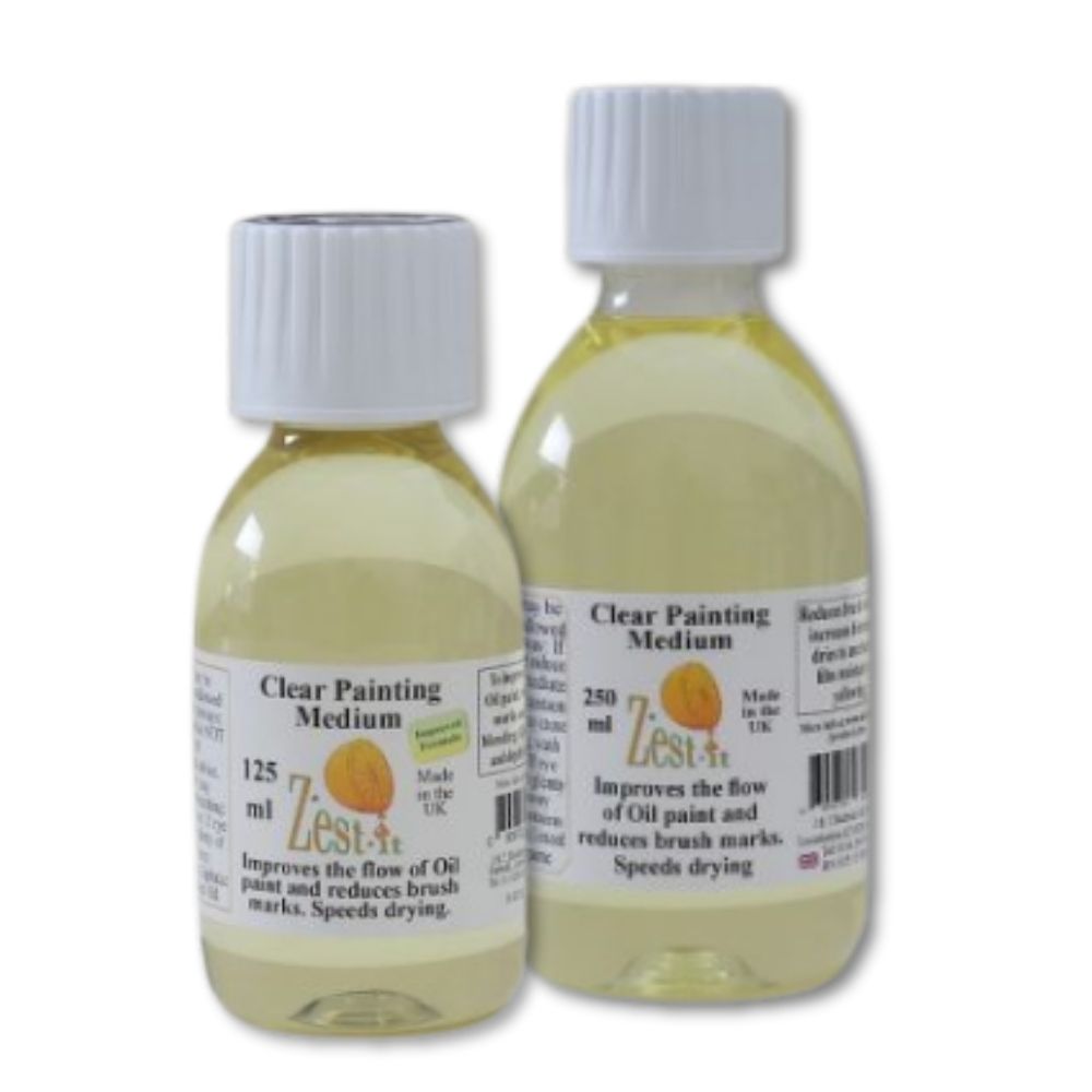 The Zest-it Clear Painting Medium is designed to facilitate the flow of oil paint, level out the brush strokes and for glazing. The Clear Painting Medium can be of assistance to both the Traditional oil painter and the Wet-on-wet artist. It is a mix of Zest-it and Linseed Stand Oil without added Varnish, it also makes the paint it is used with dry faster.